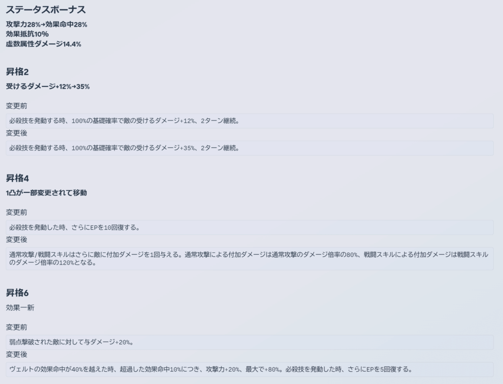 【3/17更新】ver4.2 性能調整まとめ(ホタル、フォフォ、ゼーレ、ヴェルト)【崩壊スターレイル】【リーク】【ver4.2】 2026 3/18 2026年3月13日2026年3月18日 目次ホタル 性能変更情報 変更ログ 4.1.52 4.1.53 4.1.54 4.1.55 フォフォ 性能変更情報 変更ログ 4.1.52 4.1.53 4.1.54 4.1.55 ゼーレ 性能変更情報 変更ログ 4.1.52 4.1.53 4.1.54 4.1.55 ヴェルト 性能変更情報 変更ログ 4.1.52 4.1.53 4.1.54 4.1.55 ver4.0リーク この記事が気に入ったら フォローしてね! Follow @celestia_ge 【3/17更新】愉悦開拓者の性能詳細【崩壊スターレイル】【リーク】【ver4.2】 関連記事 【1/30更新】ver4.0で追加される新光円錐、新遺物について【崩壊スターレイル】【リーク】【ver4.0】 2026年1月6日 【1/30更新】ver4.0 性能調整まとめ(花火、ブラックスワン)【崩壊スターレイル】【リーク】【ver4.0】 2026年1月4日 【1/30更新】火花の性能詳細【崩壊スターレイル】【リーク】【ver4.0】 2026年1月4日 【1/30更新】爻光(こうこう)の性能詳細【崩壊スターレイル】【リーク】【ver4.0】 2026年1月4日 コメント コメント一覧 (152件) あ 7 返信 重ねた推理で笑顔にジャンプ!名探偵 2 2 返信 キュアアンサー! 2 1 返信 銀河攻略組とかいうデマ巻き散らかすインプ稼ぎなんで許されてるのかわからん 12 返信 敵HPとか基礎ステの投稿だけしてたらいいんだけどなあ 編成とか目標ステになったライト層騙す害悪 返信 コメ欄できたんや 2 返信 ホタカスほんま覇権やな 21 12 返信 はいはい、ホタルアンチ乙。 ホタル推しなのでマジで神強化です!神運営ありがとう! 返信 前回強化のケイリュウと刃はゴミのままだったけど今回のホタルゼーレは期待できんの? 9 返信 できない寵愛偏愛受けてるホタルはまだしもゼーレは特に 俺たちはギリギリのところで夢を見ている 13 返信 ホヨバが大好きなゼーレ、ブローニャ、黄泉あたりは超強化くると思ってる。 6 5 返信 キャラ人気があって売れるから大好きなんであって 開発の趣味だけでキャラ推ししてるわけじゃないんだ なぁキュレネ 5 1 返信 ヴェルトに期待だわ、前例作ってくれればすり抜けのダメージが緩和される 41 1 返信 ゼーレは強くなくてもいいから変なロール付けだけはやめてくれ いきなり追加攻撃キャラとかになったりするのが1番萎える 行動の多さで圧倒する古典的巡狩であってくれ 14 2 返信 トパーズとかいう追加攻撃PTで使えますって顔して一回もtier1に上がってない女も救ってくれ 20 返信 恒常と交換枠は狙って好きなとこまで凸れるから強化来ても相応の強さにしかならないだろうな 2 返信 言うてダブりを重ねてこうやく交換できるから普通にガチャ引いた方が楽っていうね 大量にダブらせてそうな配信者なんかは自力で凸しちゃってるだろうし 返信 長期間見据えるのが何でしたっけ 3 返信 前回の刃と鏡流のあのゴミ調整で大炎上しないあたりこのゲームのユーザーだいぶこの運営に毒されてるし、運営もそれで完全にユーザーのこと舐め切ってるよね 今回の人選もそうで、普通もっと初期のキャラの強化が望まれてるのに、ホタルとかフォフォとか意味分からんまだいらないところ強化してくるのは完全に売上のことしか考えてないのが明白だし 17 16 返信 引かれてないキャラ強化しても喜ぶやつおらんだろ アルジェンティとホタルだったらホタル強化したほうが喜ばれるよ 60 22 返信 あいつそもそもそんな強化必要なキャラか? 周回楽やし虚構もまだ現役やのに 返信 刃鏡流は記憶もHCもつまみ食いするドカ食いバカ野郎だっただけで性能はそこまでゴミでもない 好きな奴は渋い顔しながら使えるようになったから大きな進歩 25 11 返信 ほんとそう 庭12末日4程度ならサポーター揃えれば余裕で星3取れる強さになったから良い調整。 鏡流刃ファンとしてはもっと強くしてほしいところだったけどこれからも物語に関わっていきそうだしおk 完凸ヴェルト強化に期待だな 1 1 返信 サンプルが少ないからなんとも言えないけど羅刹、ルアン、トパーズの伴星落ちしたキャラには強化すら来ないのかな… 3 返信 言っても刃ゼーレはすり抜けでも出るようになって恒常のヴェルトまで来たから単にその時じゃないってだけじゃないかな。その時っていつだよって言われたらまあ…とはなるが 13 返信 トパーズあたりはずっと可哀想だから早めに強化くることを願ってるよ。 22 返信 トパーズは不死途に喰われた 2 返信 シナズの倍率が3分の一になった代わりにホタルの倍率が3倍になってて草 22 5 返信 ホタルかなり強化されたな 自前の超撃破倍率+100%、2凸のターン制限緩和はデカい 8 6 返信 フォフォまじで伴星かこれ 4 返信 フォフォの1凸速度100%は流石に間違いだよね? 返信 ヨウおじの行動遅延効果も強化されててちょっと嬉しい 2 1 返信 デバフ2ターンしかないから2凸必須か? 1 返信 2凸ターン制限緩和は嬉しいけど結局停雲入りでも間に合わない時あるから発動条件の緩和もこれからの調整で着くといいな 1 1 返信 ヴェルトめちゃくちゃ強くなったな 8 返信 おい、恒常キャラがこ