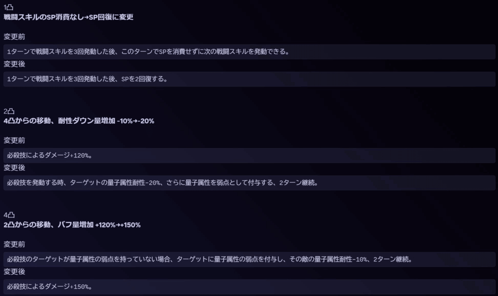 必殺技のターゲットが量子属性の弱点を持っていない場合、ターゲットに量子属性の弱点を付与し、その敵の量子属性耐性-20%、2ターン継続。