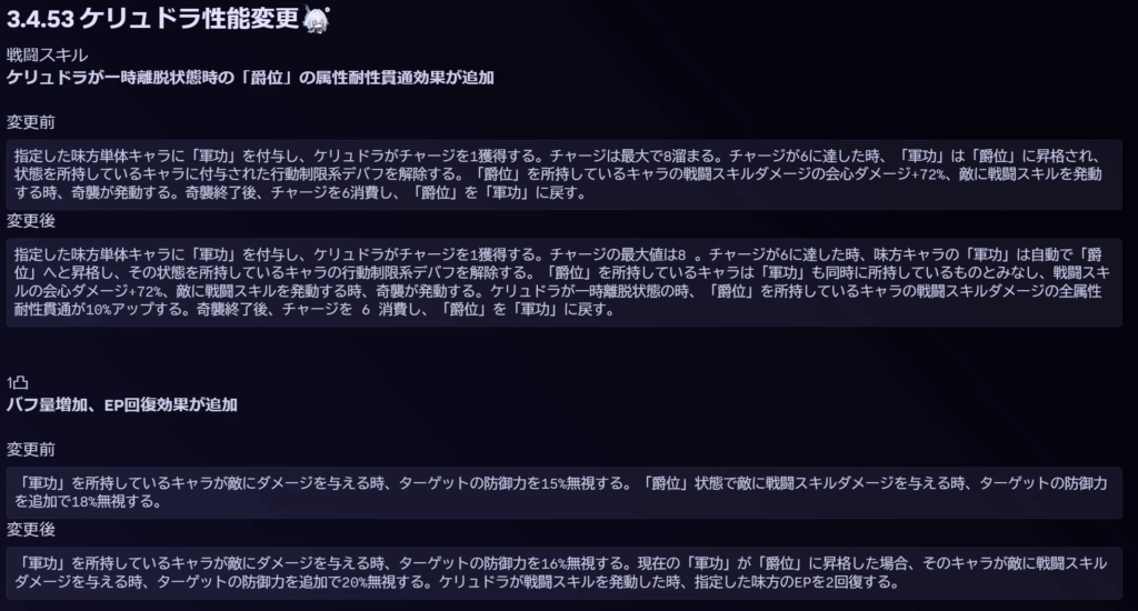 | 「軍功」を所持しているキャラが敵にダメージを与える時、ターゲットの防御力を16%無視する。現在の「軍功」が「爵位」に昇格した場合、そのキャラが敵に戦闘スキルダメージを与える時、ターゲットの防御力を追加で20%無視する。ケリュドラが戦闘スキルを発動した時、指定した味方のEPを2回復する。 | |
