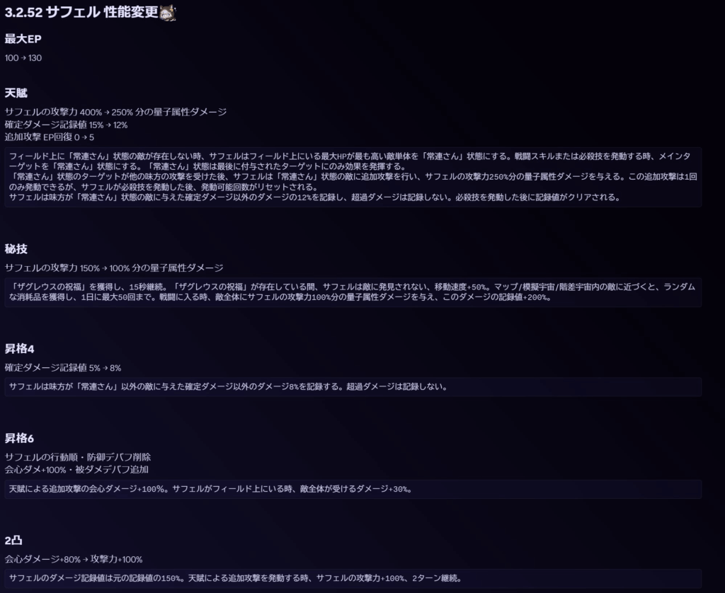 | 強化 「ザグレウスの祝福」を獲得し、15秒継続。「ザグレウスの祝福」が存在している間、サフェルは敵に発見されない、移動速度+50% 。マップ/模擬宇宙/階差宇宙内の敵に近づくと、ランダムな消耗品を獲得し、1日に最大50回まで。 「ザグレウスの祝福」を持つ場合、戦闘に入る時、敵全体にサフェルの攻撃力100%分の量子属性ダメージを与え、このダメージの記録値+200%。 |