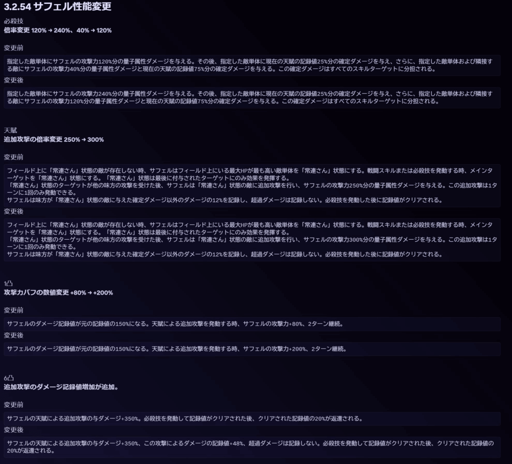 | 天賦による追加攻撃の会心ダメージ+100%。サフェルがフィールド上にいる時、敵全体が受けるダメージ+40%。 |