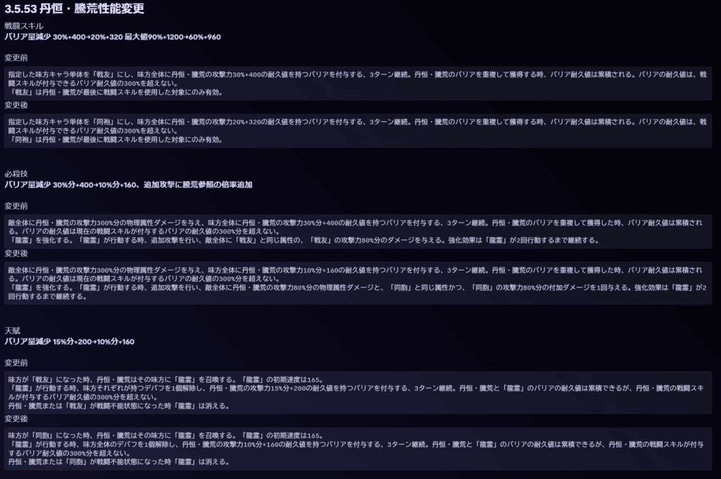 強化後の「龍霊」は行動時、追加で残りHPが最も高い敵単体に「同袍」の攻撃力40%分の、対応する属性の付加ダメージを1回与える。