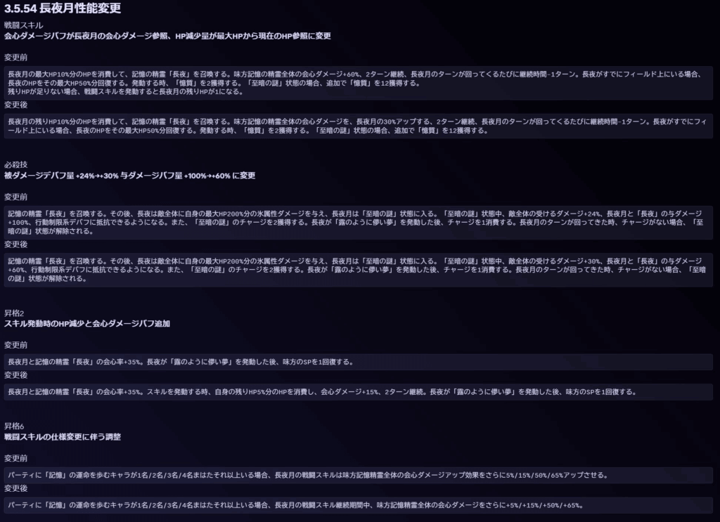 | パーティに「記憶」の運命を歩むキャラが1名/2名/3名/4名まはたそれ以上いる場合、長夜月の戦闘スキル継続期間中、味方記憶精霊全体の会心ダメージをさらに+5%/+15%/+50%/+65%。 |