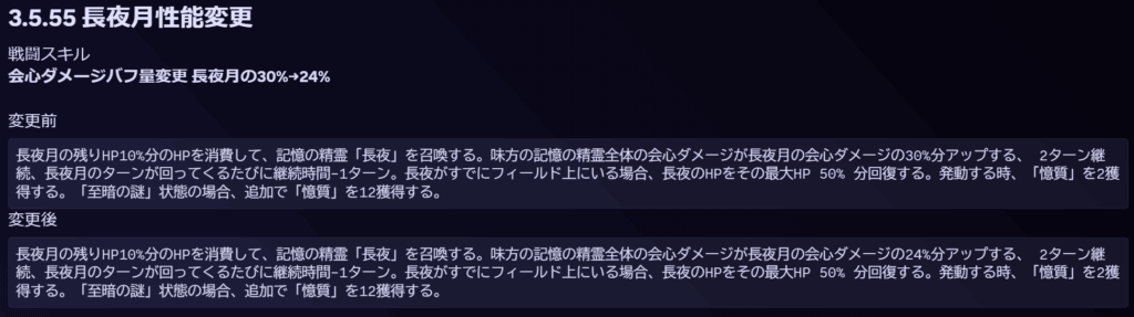 | サポート 長夜月の残りHP10%分のHPを消費して、記憶の精霊「長夜」を召喚する。味方記憶の精霊全体の会心ダメージを、長夜月の24%アップする、2ターン継続、長夜月のターンが回ってくるたびに継続時間-1ターン。長夜がすでにフィールド上にいる場合、長夜のHPをその最大HP50%分回復する。発動する時、「憶質」を2獲得する。「至暗の謎」状態の場合、追加で「憶質」を12獲得する。 |