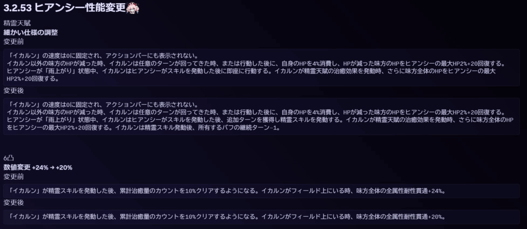 | 回復 「イカルン」の速度は0に固定され、アクションバーにも表示されない。 イカルン以外の味方のHPが減った時、イカルンは任意のターンが回ってきた時、または行動した後に、自身のHPを4%消費し、HPが減った味方のHPをヒアンシーの最大HP2%+20回復する。 ヒアンシーが「雨上がり」状態中、イカルンはヒアンシーがスキルを発動した後、追加ターンを獲得し精霊スキルを発動する。イカルンが精霊天賦の治癒効果を発動時、さらに味方全体のHPをヒアンシーの最大HP2%+20回復する。イカルンは精霊スキル発動後、所有するバフの継続ターン−1。 |