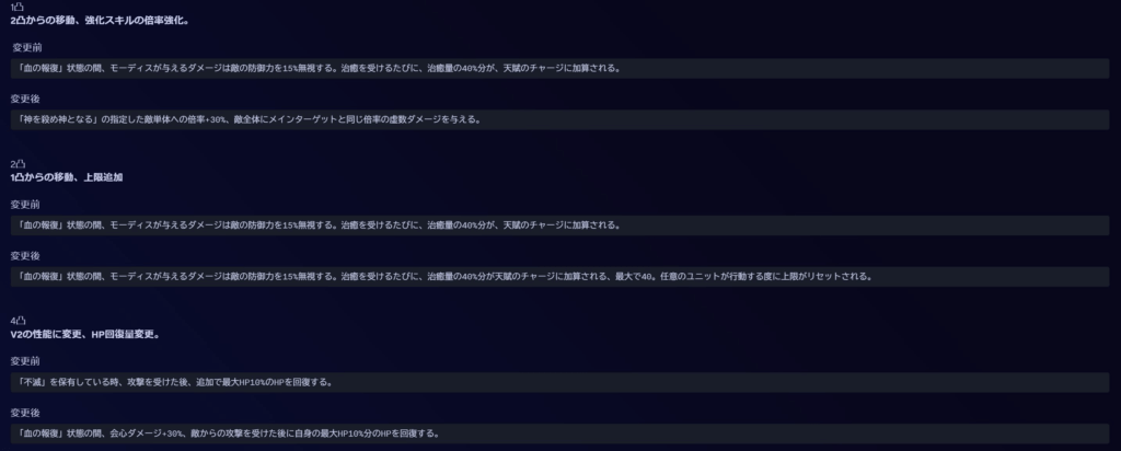 | 「血の報復」状態の間、モーディスが与えるダメージは敵の防御力を15%無視する。治癒を受けるたびに、治癒量の40%分が天賦のチャージに加算される、最大で40。任意のユニットが行動する度に上限がリセットされる。 | |