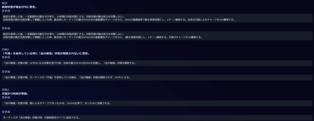 | 「血の報復」状態の間、モーディスがHPが0になる攻撃を受けた時、「血の報復」状態が解除されない。この効果は1回の戦闘で3回まで発動可能。 | |