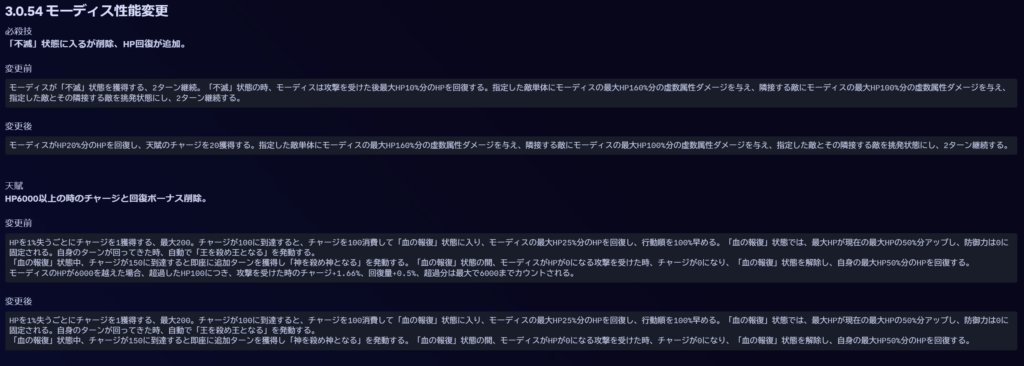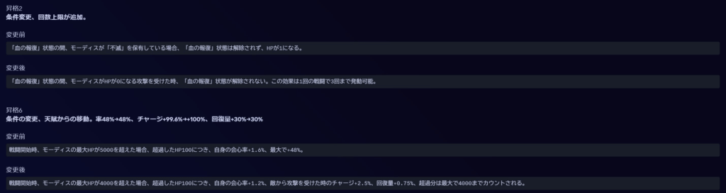 | 強化 HPを1%失うごとにチャージを1獲得する、最大200。チャージが100に到達すると、チャージを100消費して「血の報復」状態に入り、モーディスの最大HP25%分のHPを回復し、行動順を100%早める。「血の報復」状態では、最大HPが現在の最大HPの50%分アップし、防御力は0に固定される。自身のターンが回ってきた時、自動で「王を殺め王となる」を発動する。 「血の報復」状態中、チャージが150に到達すると即座に追加ターンを獲得し「神を殺め神となる」を発動する。「血の報復」状態の間、モーディスがHPが0になる攻撃を受けた時、チャージが0になり、「血の報復」状態を解除し、自身の最大HP50%分のHPを回復する。 |